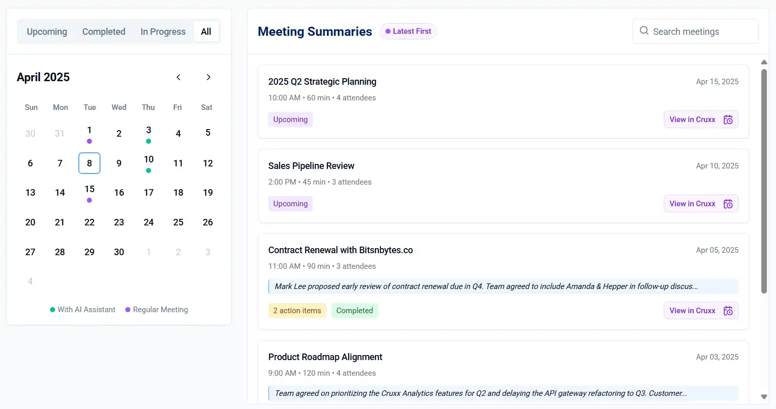 Lets meet integrates with Cruxx to ensure that critical next steps captured after meetings are assigned accountabilities and followed up till the logical conclusion.