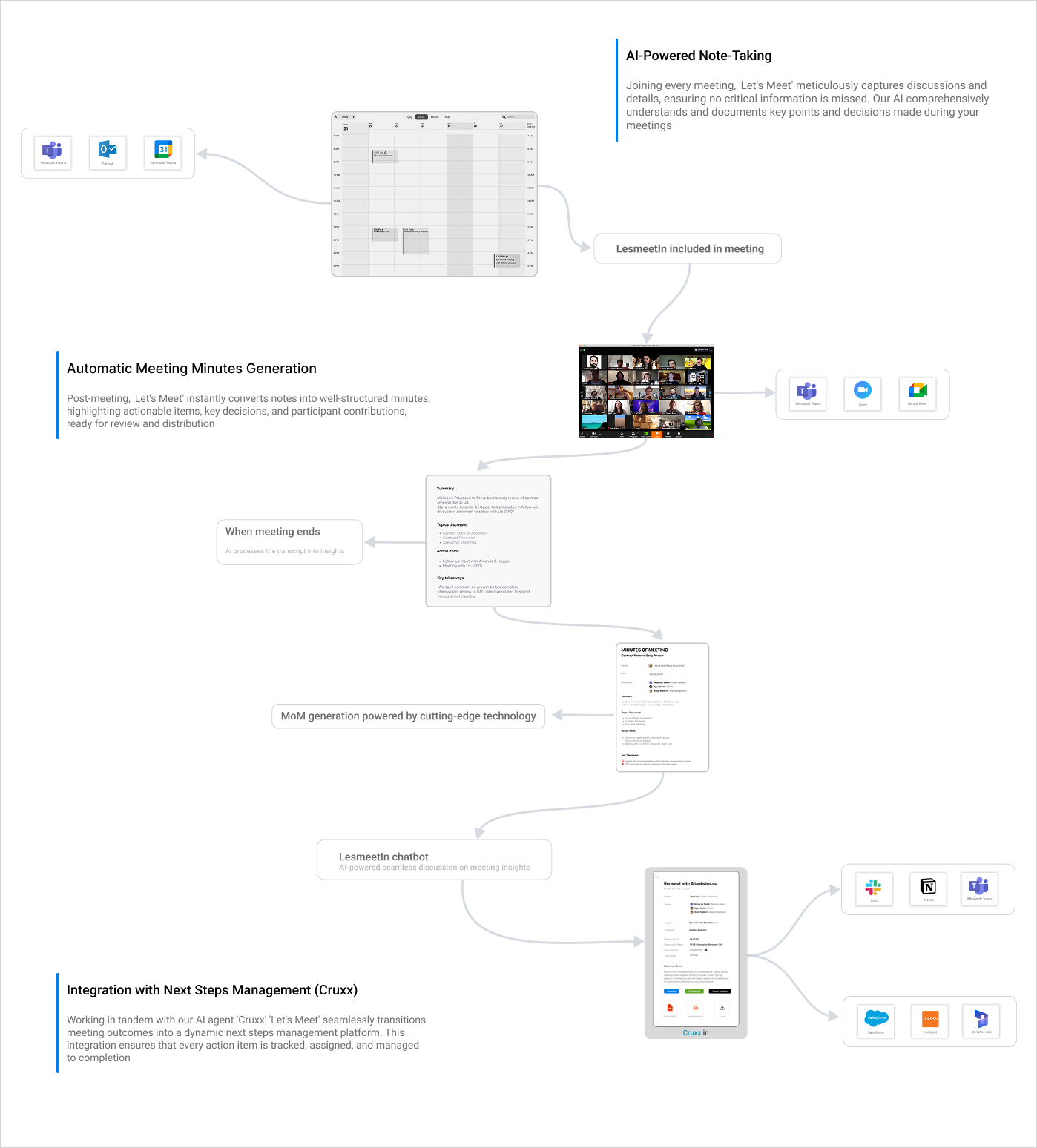 Let's Meet' links with your existing CRM systems, aligning meeting outcomes with customer data, enhancing follow-ups, and driving sales activities based on real-time insights from your discussions